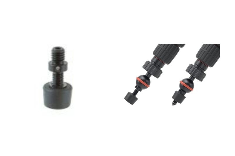 アームボールの先端にねじ込んで取り付けます。ゴムを回転させるとスパイクに切り替わり、三脚の設置条件に合わせて使い分けできます。