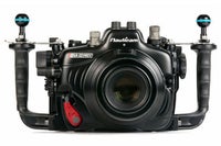 外部ストロボのTTL調光に対応 TTLオート調光に対応したフラッシュトリガー「NA TTLコンバーター Canon 」に対応。任意の絞り値での撮影や生態シーンの速写性に効果を発揮します。 マルチコントローラー カメラ本体の形状を継承し、陸上と変わりない直感的な操作を可能にしました。ハウジング内部機構のレイアウトを工夫し、ボディの最右端にセレクターの位置をシフトさせています。 右手集中コントロール 水中での操作性を向上させるため、操作ボタン/レバーを右手側に集約させました。グリップから手を離すことなく、メイン電子ダイヤル、サブ電子ダイヤル、マルチファンクション、AF-ON、ストロボ調光補正、動画撮影やISO感度設定などに素早くアクセスできます。 アクセスランプの点灯/点滅の状態が視認可能 カードへの記録/読み出し中や、消去中、データ転送中などの状況が即座に視認できます。 バキュームリークセンサーのリセット ハウジング内部を陰圧にすることで、陸上でシール状態がチェックできる「バキュームリークセンサー」の圧力センサーを標準装備。別売の「バキュームバルブII」の追加のみでフルシステムを組むことができます。 オプション 材質 耐腐食アルミ合金、耐摩擦性ポリカーボネート 耐圧水深 100m サイズ W358 x H187 x D135mm 重量 2910g ポートサイズ N120 ストロボ接続** オプティカルシンクロコネクター、TTLコンバーターCanon(オプション) 付属品 ダイレクトベースX2、スペアOリング、Oリングリムーバー、Oリンググリス、CR2032電池、六角レンチセット、ボディキャップ、キャリングバッグ *3FG(3本指グリップ)またはS4FG(ボディとの距離が近い4本指グリップ)のいずれかをお選びください。 **ニコノスシンクロコネクターへの仕様変更も承ります。 仕様は予告なく変更する場合があります。予めご了承ください。 オプション N120ポート バキュームバルブ スーパービューファインダー180II スーパービューファインダー45II TTLコンバーター ユニバーサルOPファイバー SMC-1 SMC-2 フリップレンズアダプター ハウジングランヤード