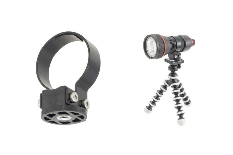 LFシリーズLEDライト1灯を、1/4-20UNC規格のネジを備えた三脚や「シューベース 1/4-20UNC」へ接続するためのオプションです。三脚に取り付けたライトをカメラシステムから分離して設置することで、被写体の後ろからライトを照射するバックライト撮影や、夜間の集魚灯など、様々な活用が可能です。また「シューベース 1/4-20UNC」を介して、ハウジングのアクセサリーシューにライトをシンプルに取り付けできます。
