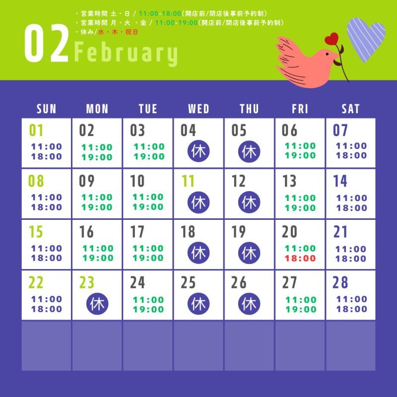 2026年2月度 営業時間・臨時休業のご案内